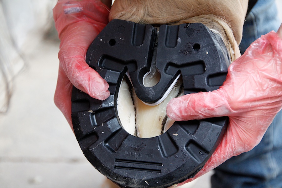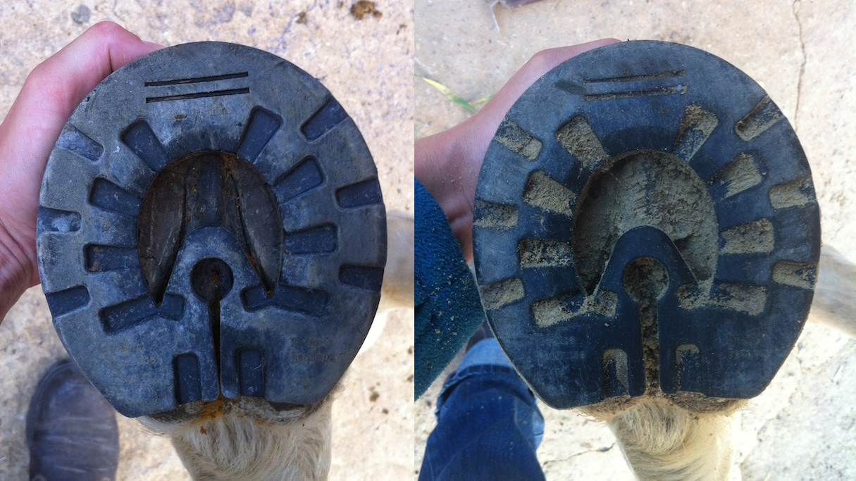 Der Schlitz im Steg der Performance hatte sich nach ein paar Wochen bereits sichtlich geweitet. So konnte der Huf auf natürliche Weise im unteren Bereich in die Breite wachsen. Dies wäre unter einem herkömmlichen, festen Hufschutz nur erschwert möglich gewesen und hätte wahrscheinlich den Huf ehr eingeengt.