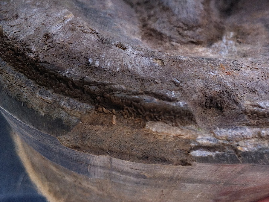 Ist der Pilz noch nicht so weit vorgedrungen, kann man ihn dennoch an seiner weißlich, bröseligen Struktur erkennen. Meist ist der Strahl an diesen Stellen ganz fein, faserig zerfleddert.
